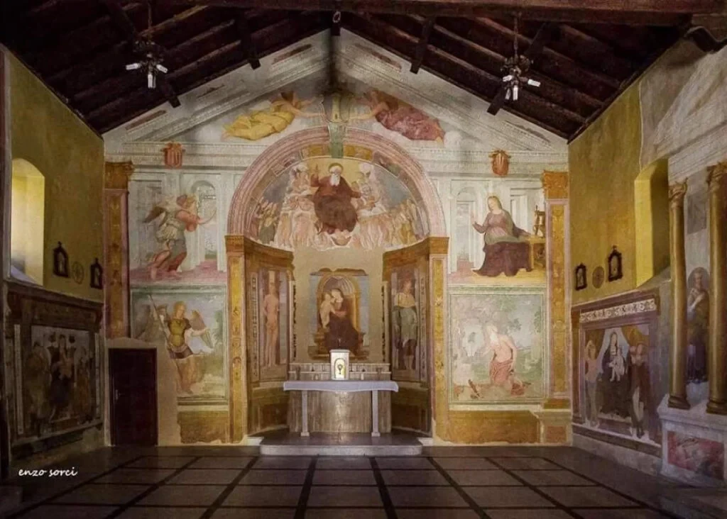 La Chiesa di San Sebastiano fu costruita nel 1200 a distanza dal centro abitato per accogliere i pellegrini e i viandanti durante le quarantene per le epidemie di peste e colera. Per questa ragione, la chiesa fu successivamente dedicata anche a San Rocco, ambedue protettori degli appestati. Le statue dei due Santi sono nell’abside insieme a una Madonna con Bambino.