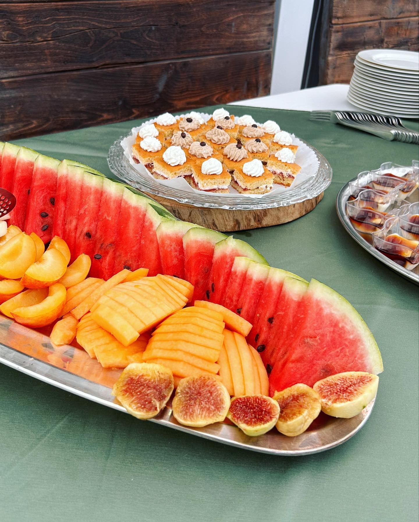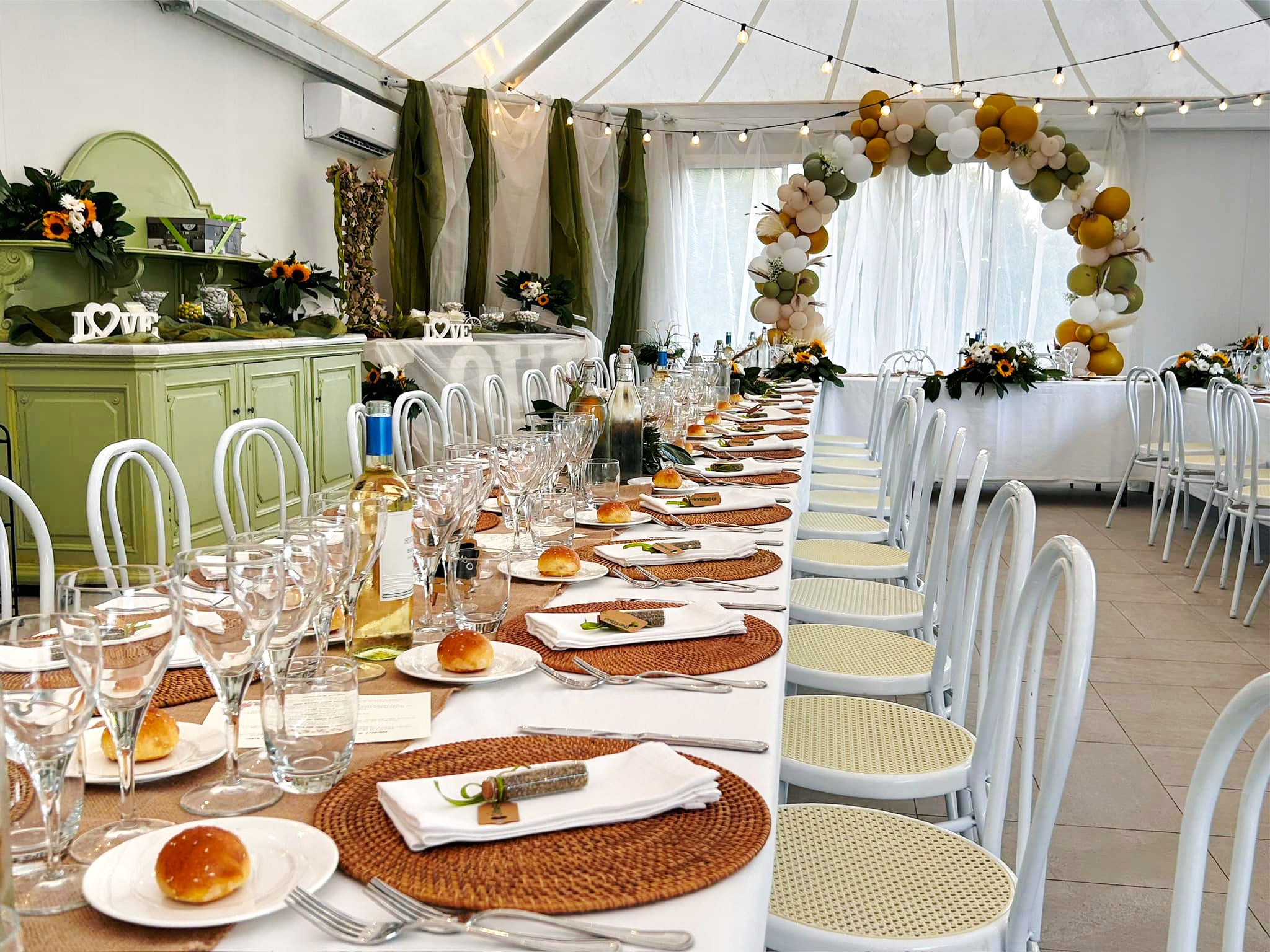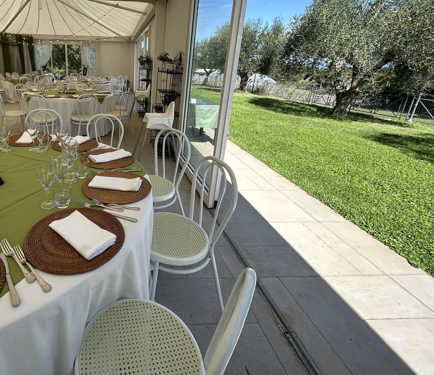 Tutto intorno alla struttura corre un rustico lastricato allestito in base all’occasione con una struttura climatizzata con ampie vetrate sul giardino degli ulivi che ospita fino a 100 persone sedute a tavola.