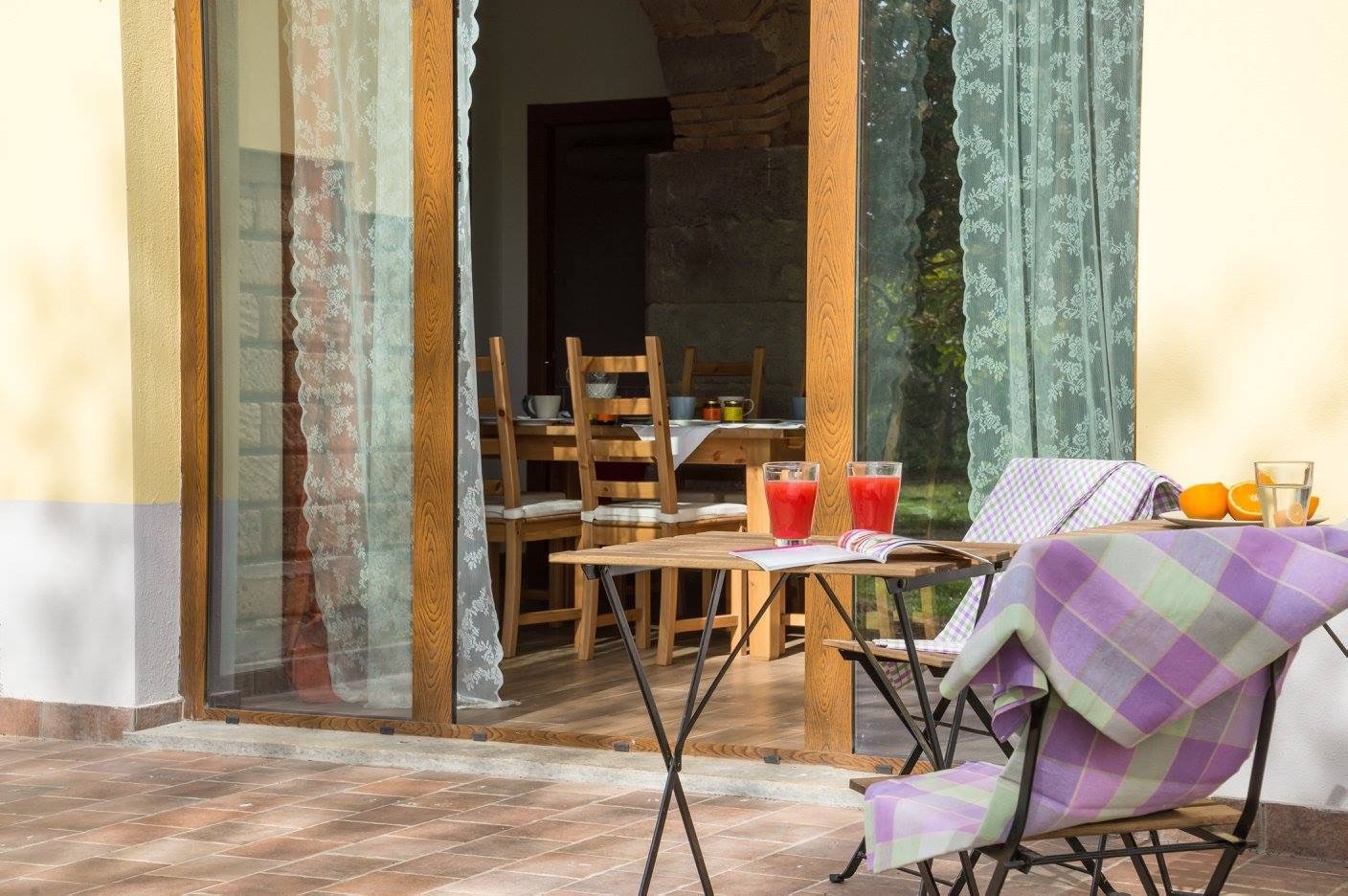 Il Frantoio, che ospitava l’antico frantoio aziendale per la molitura delle olive, degli uliveti adiacenti. Conserva una colonna di nenfro e le arcate che sorreggono tuttora le capriate del tetto in travi di legno e pianelle di terracotta. Il Frantoio è un appartamento di circa 65 mq, composto da un ampio salone con angolo cottura, un bagno e due camere da letto matrimoniali; con possibilità di ospitare ulteriori due persone in un confortevole divano letto. Al suo esterno si può ancora ammirare la macina originale in pietra;